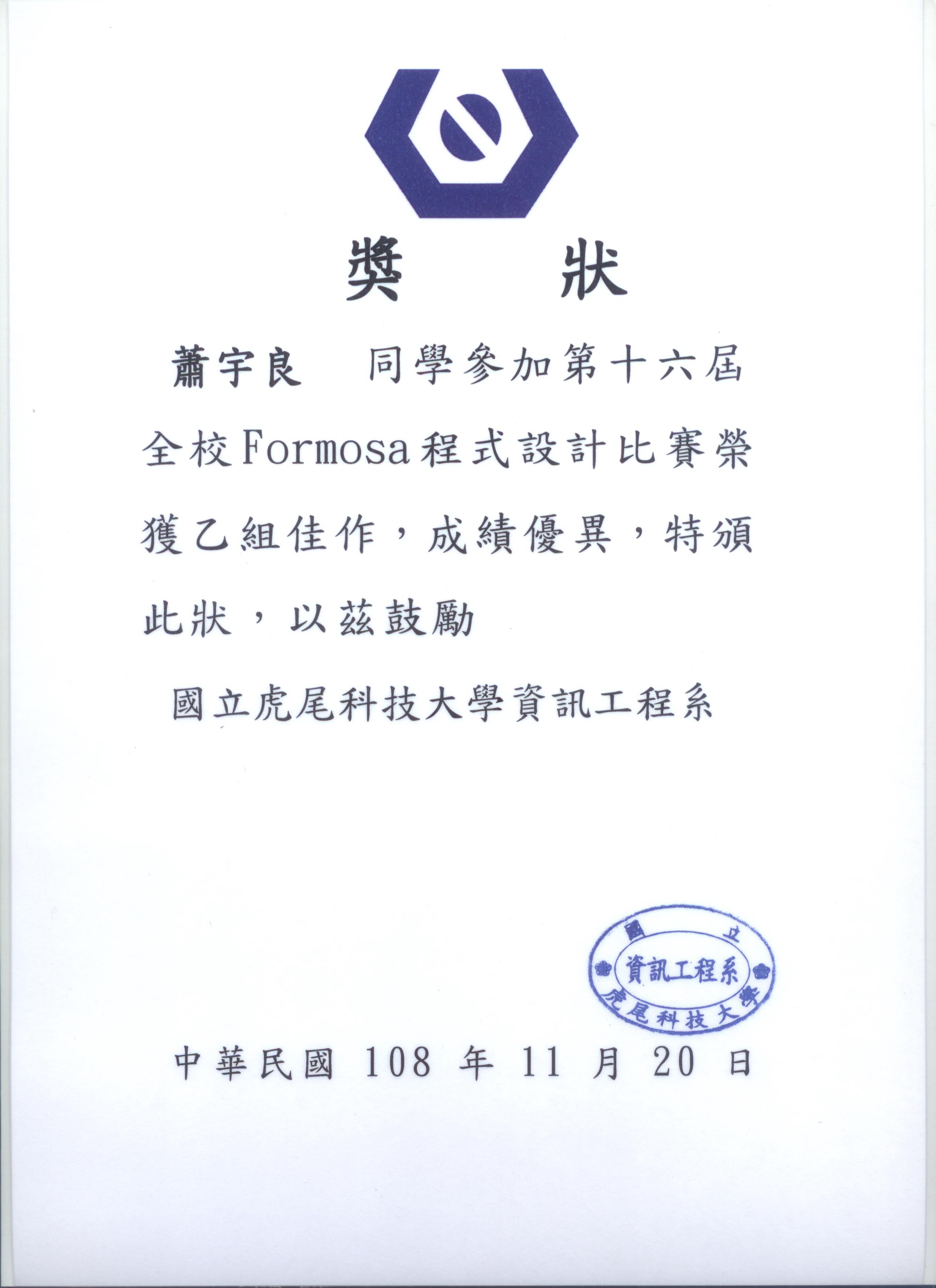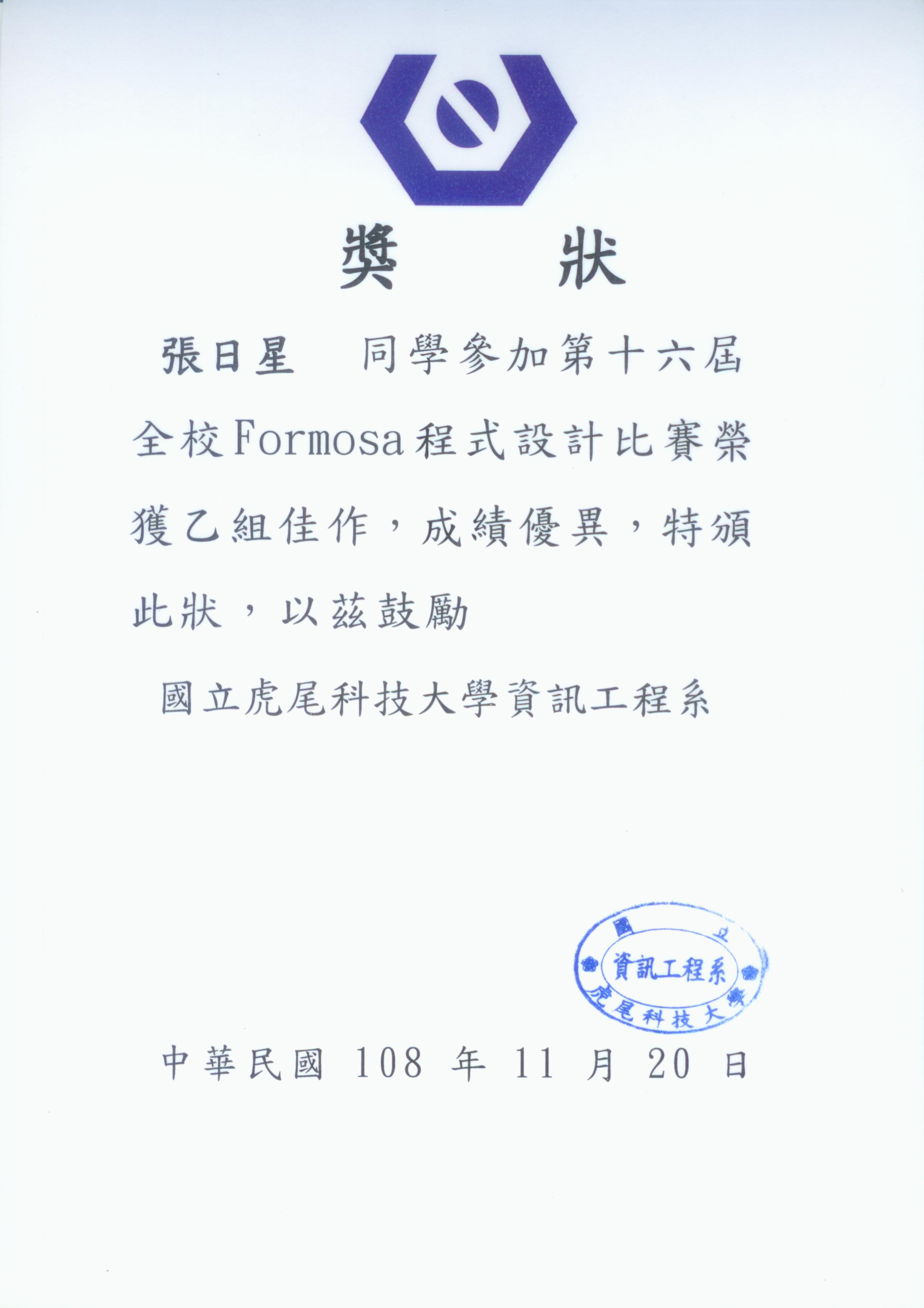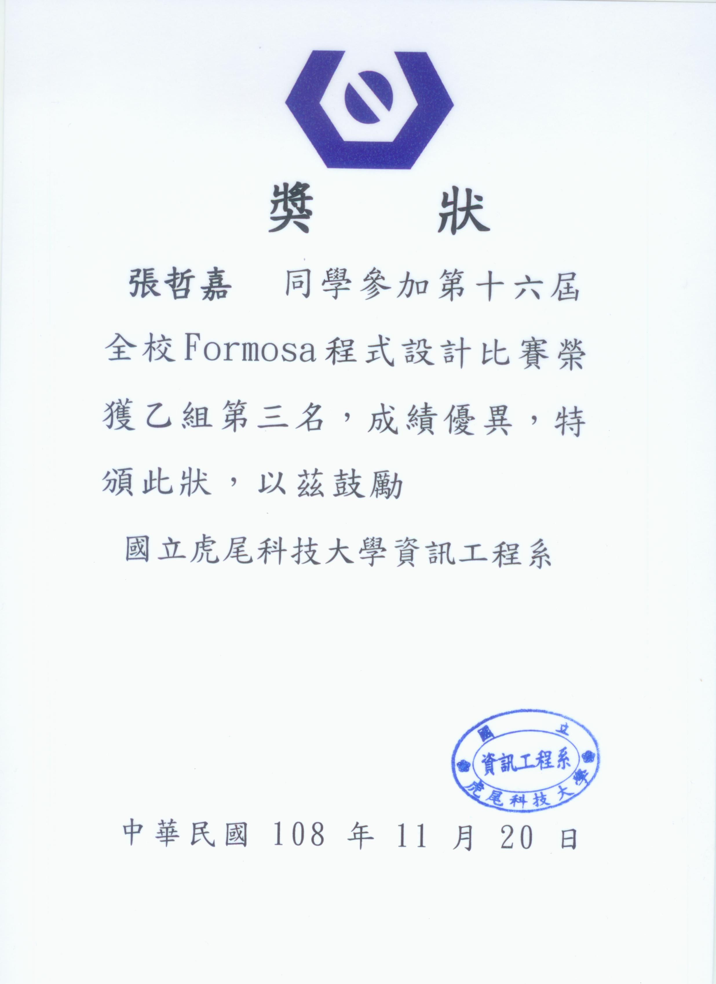 [恭賀資訊]本系陳文瑞教授指導學生參加2019第十六屆FORMOSA程式設計比賽榮獲佳績! 2019-11-29 SystemAdmin 蕭宇良同學榮獲乙組佳作 張日星同學榮獲乙組佳作 張哲嘉同學榮獲乙組第三名 陳恒孝同學榮獲乙組第三名 本系陳文瑞教授指導學生參加2019第十六屆FORMOSA程式設計比賽榮獲佳績! 蕭宇良同學榮獲乙組佳作 張日星同學榮獲乙組佳作 張哲嘉同學榮獲乙組第三名 陳恒孝同學榮獲乙組第三名