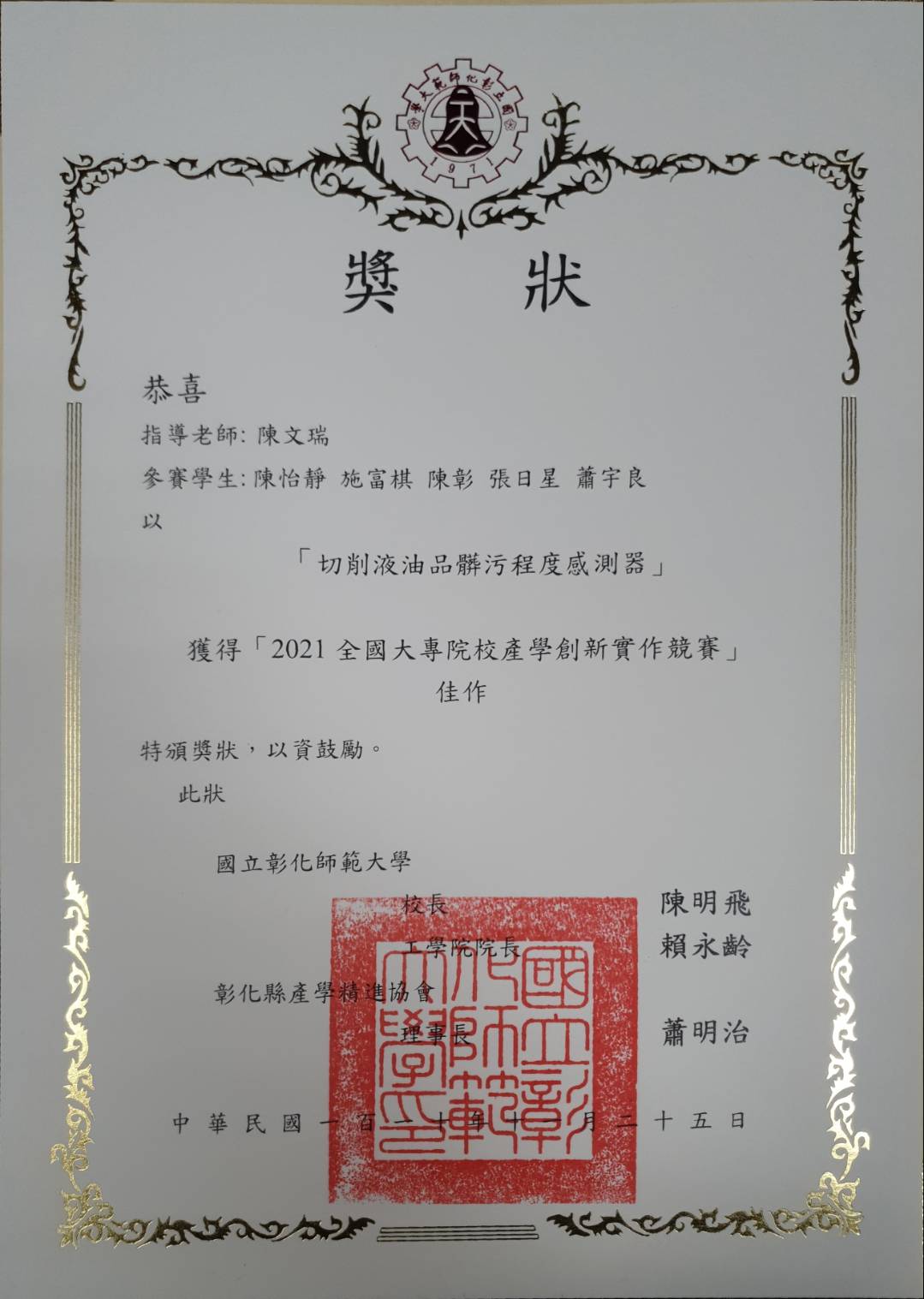 恭賀!本系陳文瑞老師指導學生施富棋、陳怡靜、陳彰、張日星、蕭宇良參加『2021全國大專院校產學創新實作競賽』,以『切削液油品髒污程度感測器』榮獲佳作獎,電子系全體師生恭賀!